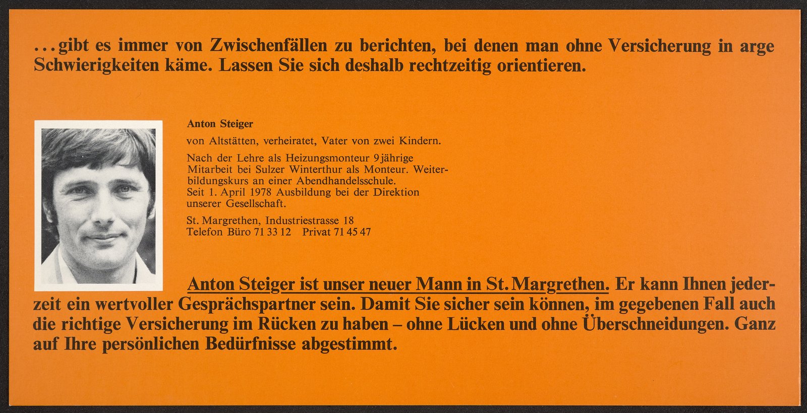 Entré au service de l’agence générale d’Altstätten en 1975, il influence son évolution de manière déterminante.