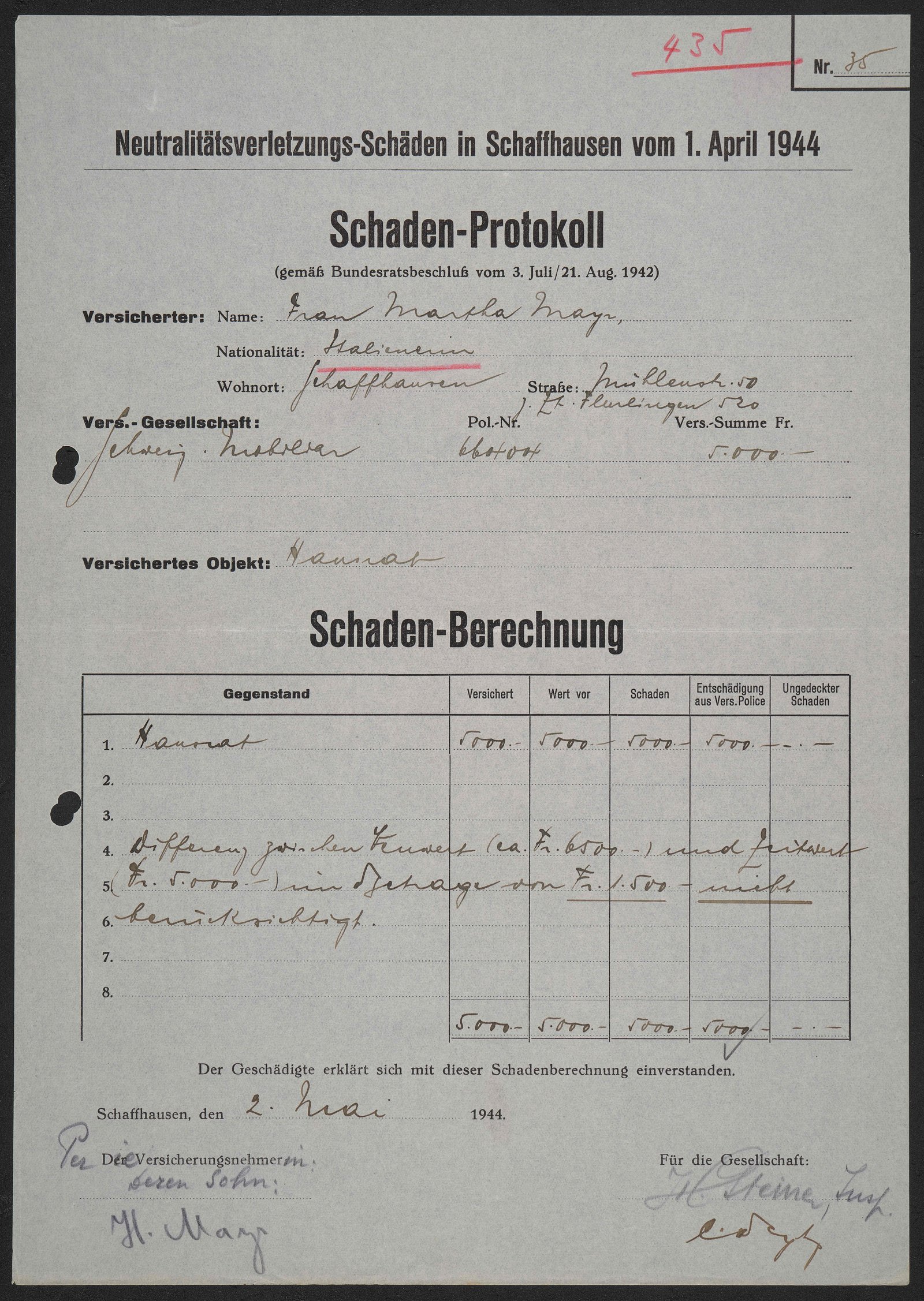 Au total, la Suisse est bombardée 77 fois par les Alliés durant le conflit. Schaffhouse paie le plus lourd tribut : le 1er avril 1944, 40 personnes meurent et plusieurs autres sont blessées, 66 bâtiments sont détruits en tout ou partie. Le Conseil fédéral ordonne à tous les assureurs suisses contre l’incendie de participer, à fonds perdu, à la couverture de ces dommages dus à une violation de neutralité. La Mobilière débourse ainsi plusieurs millions de francs pour Schaffhouse. Au total, environ 500 assurés de la Mobilière sont concernés.