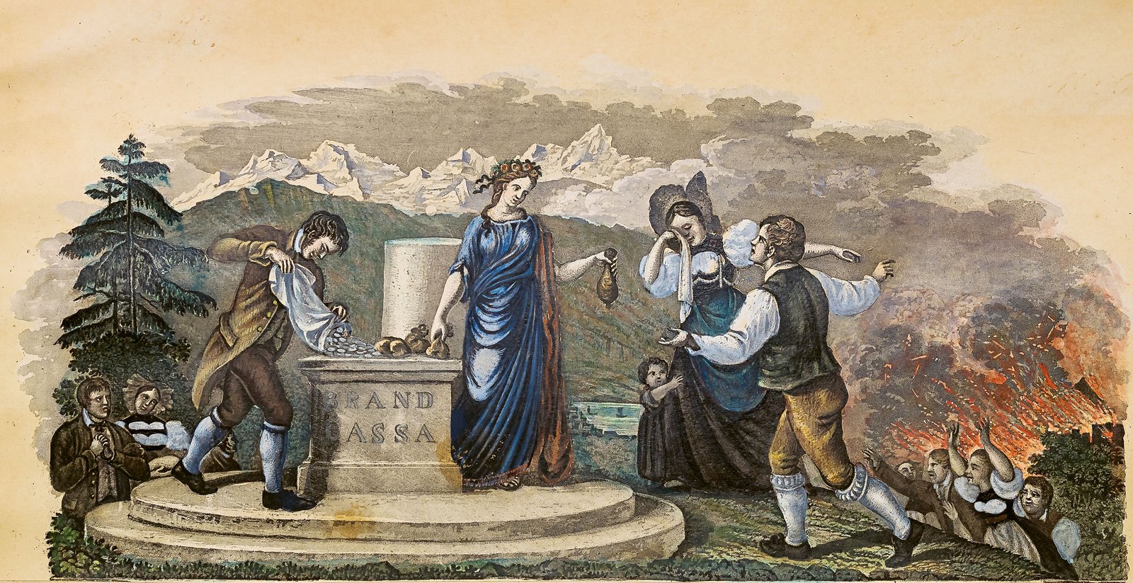 Legrand met en scène des sociétaires en costumes traditionnels et un feu menaçant, le tout sur fond de paysage alpin. Au centre : la caisse, et le soutien ô combien précieux qu’Helvetia, figure personnifiant la Confédération, fournit en tendant aux malheureux une bourse pleine. Tout est dit dans cette image, qui ornera pendant des années les polices d’assurance.