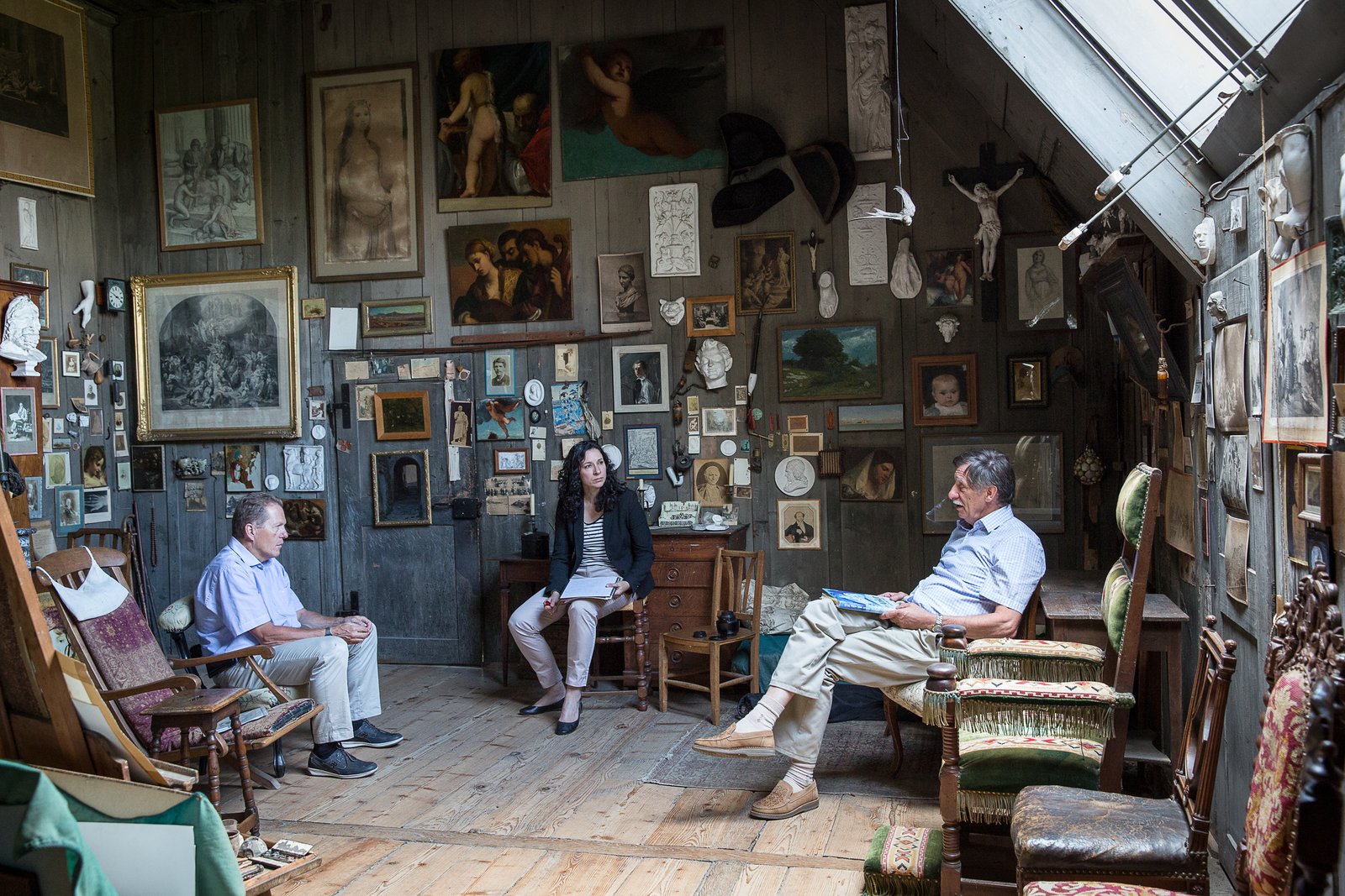 Accrochée au mur de l’atelier, la pendule de la Forêt-Noire fait entendre son tic-tac. De grandes lucarnes laissent passer la lumière qui éclaire le chevalet et deux palettes de couleurs. Les murs sont couverts d’esquisses, de photos, de figures en plâtre et d’étranges objets souvenirs, 750 pièces au total, dont chacune relate une histoire de la vie d’Albert Anker. Il y a même des cendres dans la cheminée, comme si l’artiste avait séjourné dans son atelier quelques jours auparavant.