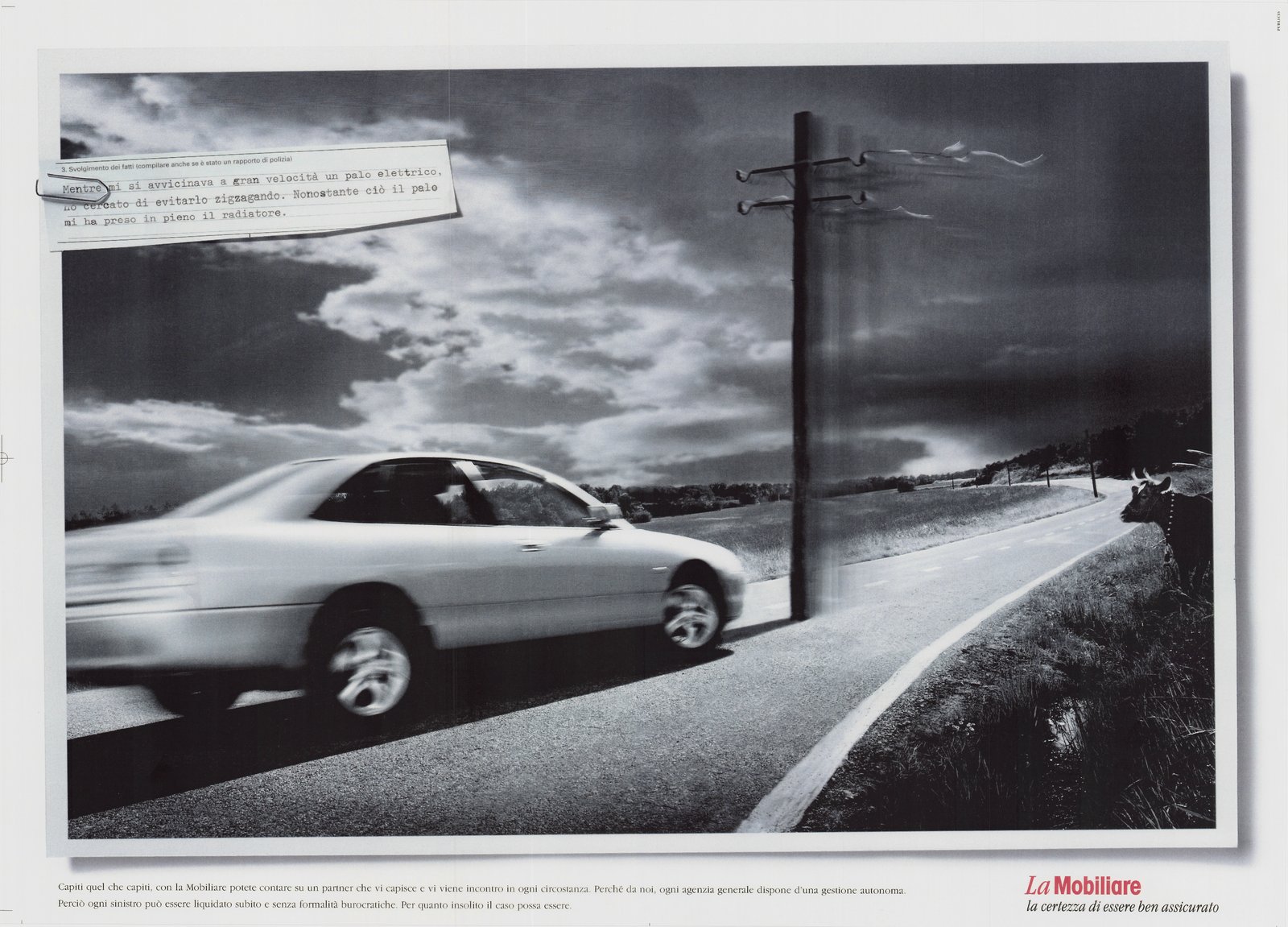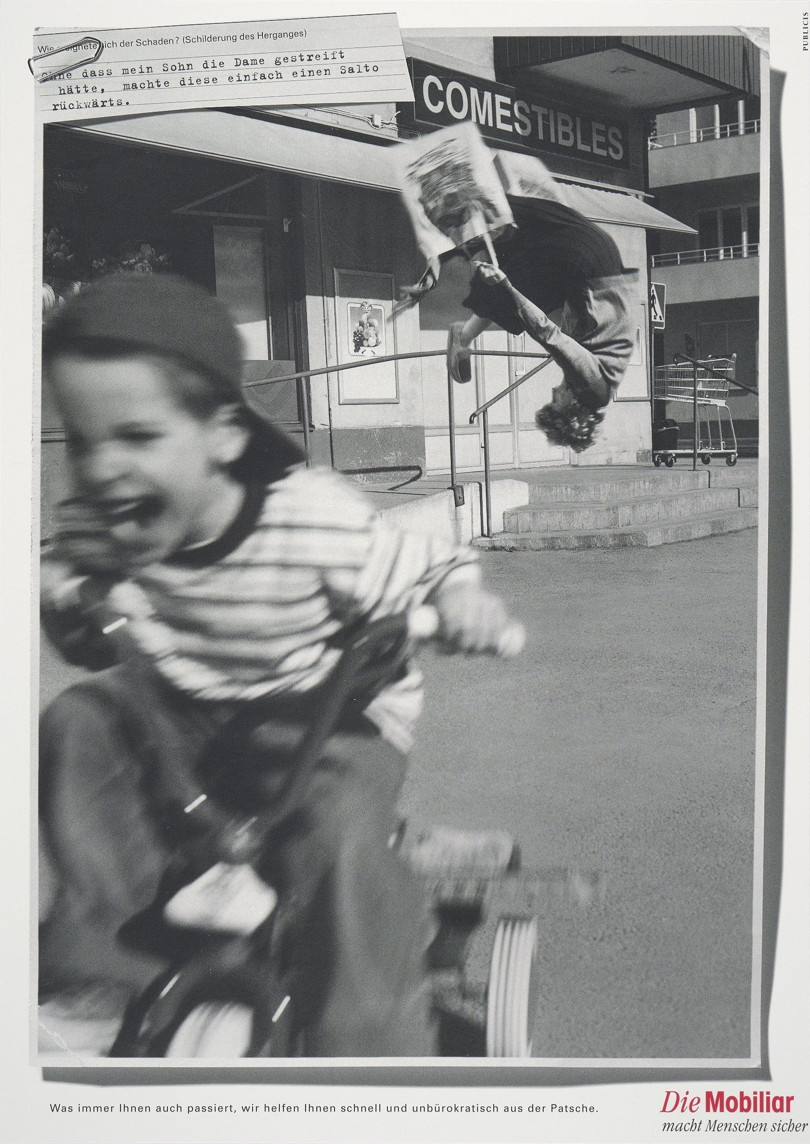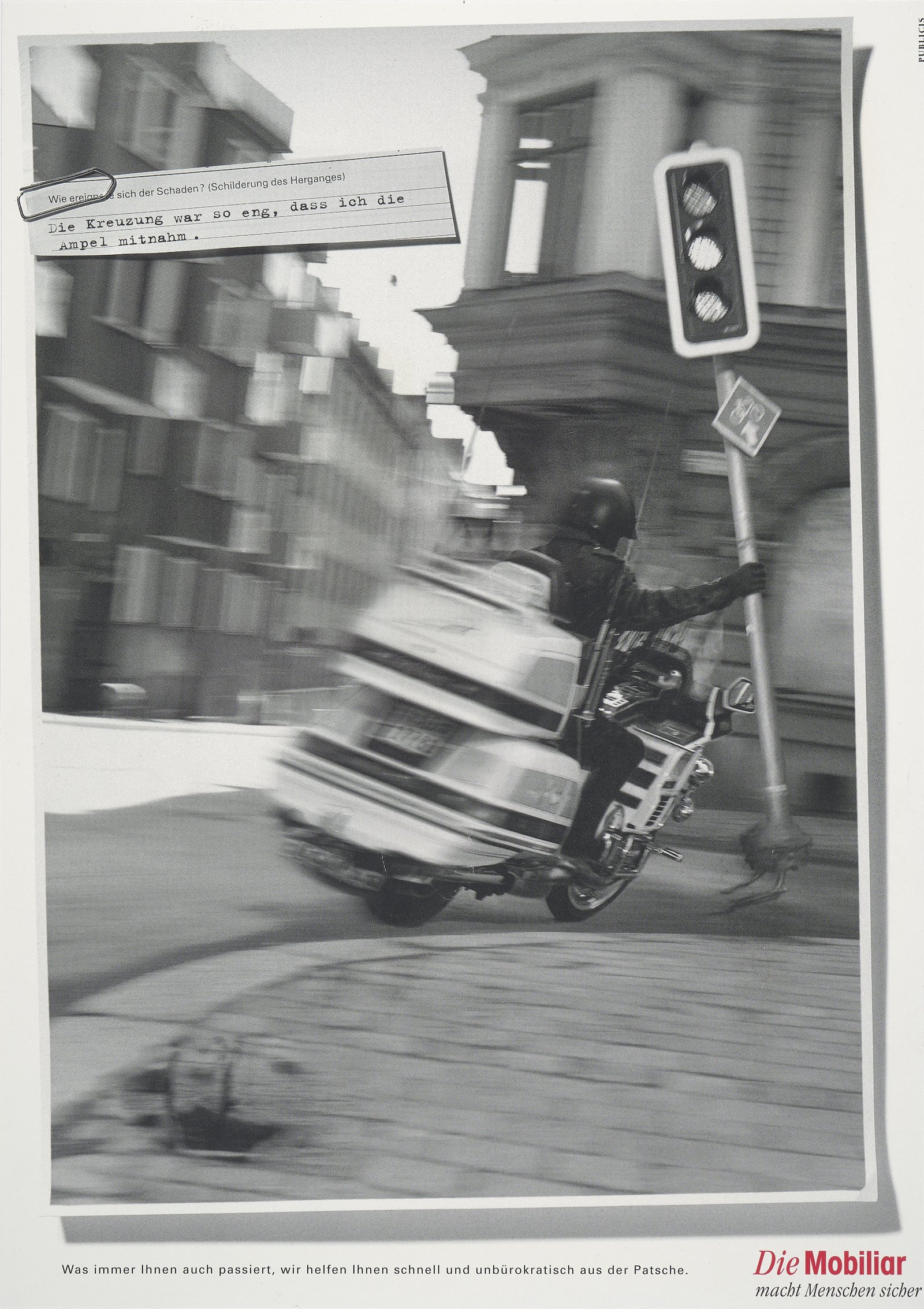L’agence de publicité Aebi, Strebel propose à la Mobilière d’utiliser pour une campagne publicitaire les descriptions de sinistres parfois approximatives que lui envoie la clientèle. Par exemple: «Le poteau téléphonique se dirigeait vers moi à grande vitesse. Malgré mes manoeuvres en zigzag pour l'éviter, le poteau est venu me percuter de plein fouet.» Ou: «Je suis tombé de l'échelle en effectuant le montage d'un client.» De telles maladresses de formulation prêtent à sourire mais sont humaines. Et soucieuse de placer l’humain au cœur de son action, la Mobilière veille à ce que toute l’aide nécessaire soit apportée.