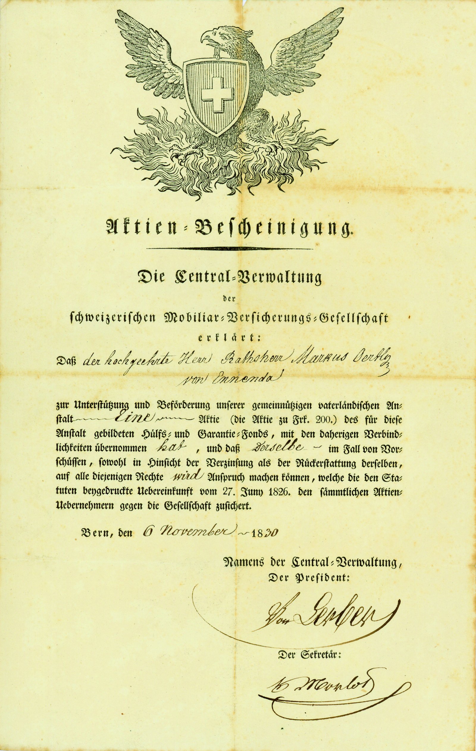 Les fondateurs de la Mobilière ne reculent devant aucun obstacle. Afin de pouvoir venir en aide à leur clientèle sans faire faillite, même en cas de sinistralité élevée, ils misent sur la solidarité. L’une de leurs solutions pour lever des fonds: les actions!