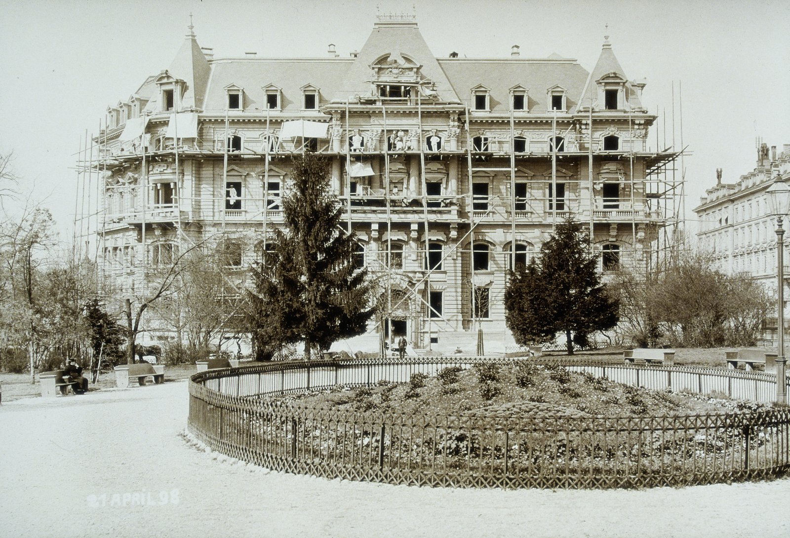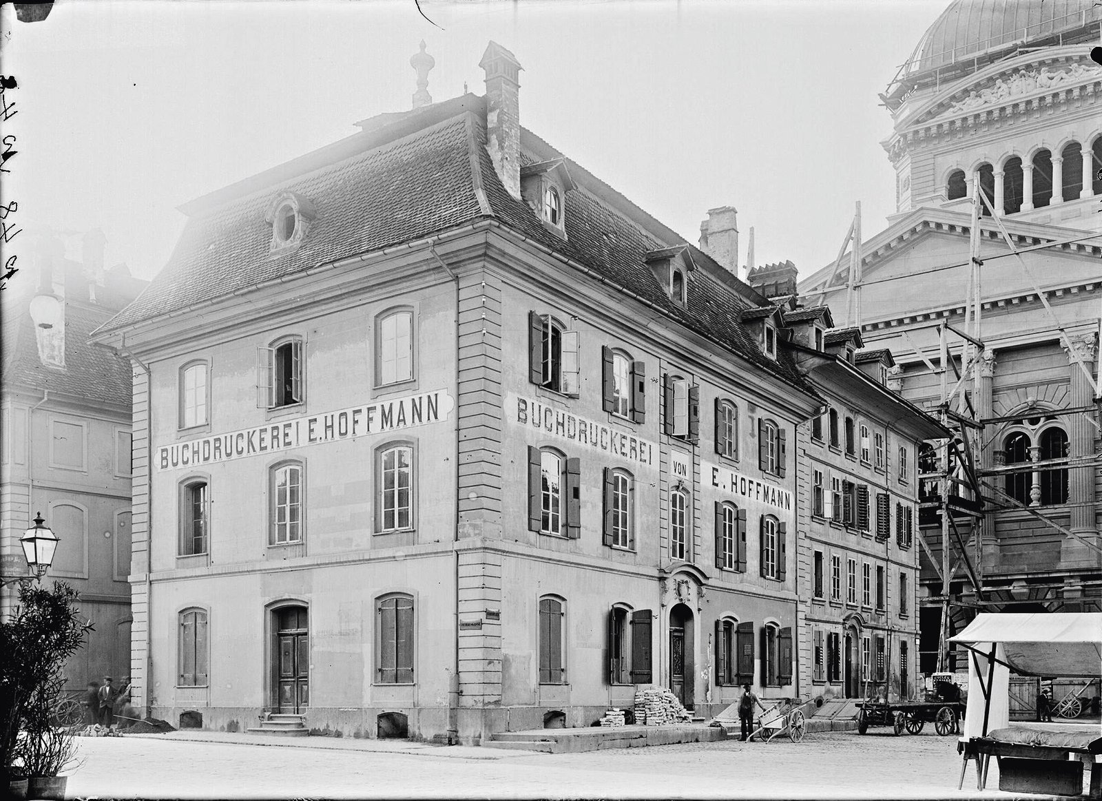 L’ancien bâtiment de la Direction de la Mobilière (tronqué à gauche). Démolition en 1900 pour la construction de la place Fédérale. En arrière-plan, le Palais fédéral est presque achevé.